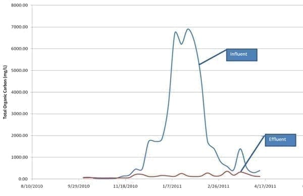 The data plotted in the chart shows performance of the BNIA treatment system over the course of approximately six (6) months. The loading to the system is highest during the coldest of the winter months (i.e. December – March), which is to be expected. Of interest though is the fact that loading during the remaining months is fairly low. Despite fact that bacteria are essentially starved for a better part of year, a vibrant and active biomass is maintained within the system to treat peak loading to 95%+ removal. The extent of biomass reduction in the summer is due to insufficient food supply and predation.