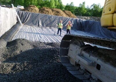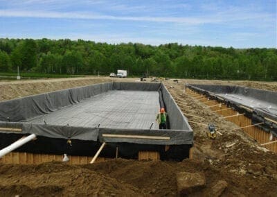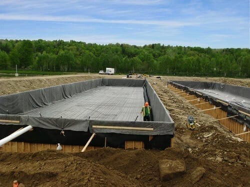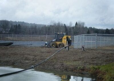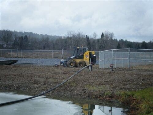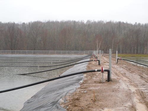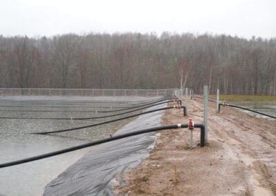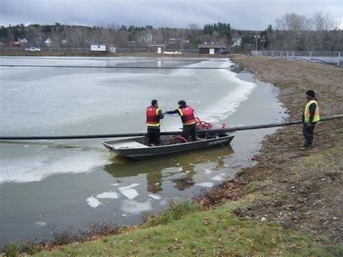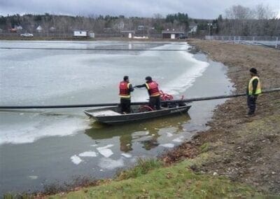 The existing facultative treatment lagoon at Doaktown was first drained for sludge removal, and then expanded. It was divided into two separate cells by a geomembrane floating baffle curtain,m used to divert flow and maximize hydraulic retention time. The optAER system was then added to the two cells individually to assist with improved year-round BOD and TSS removal through bacterial degradation and solids settling.