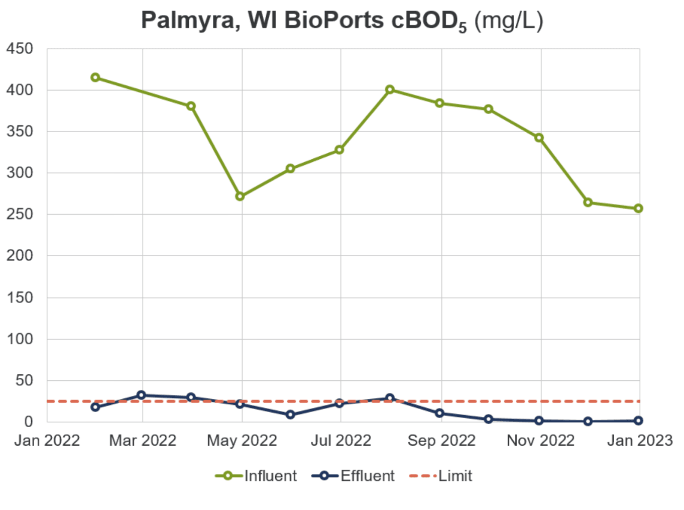 The system has been providing wastewater treatment for Palmyra since being commissioned in January 2022. Effluent samples from March 2022 indicated that the system had fully acclimated, with NH3-N concentrations <0.5 mg/L towards the end of winter. The following graphs show the successful performance of Palmyra’s MBBR from March through the end of 2022.