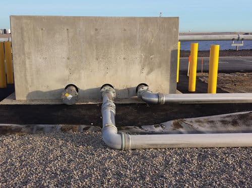 Aeration also aids in the primary treatment of contaminated water by providing oxygen, as well as residence and contact time for the natural bacteria that ultimately convert stormwater contaminates, like glycol, into carbon dioxide, water, and inert ash. At YYC, the focal point of the optAER system is the fine-bubble aeration distributed through diffusers on lateral piping placed across the bottom of the pond. This placement serves as protection from ice movement during winter, while also maximizing the oxygen transfer efficiency of the system. The diffusers are fused to lateral piping, which are then held to the bottom of the pond by geotextile sandbags to avoid using concrete weights. To increase durability and minimize maintenance, all in-water piping, joints, and fittings were made from high-density polyethylene (HDPE).